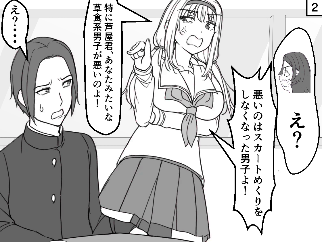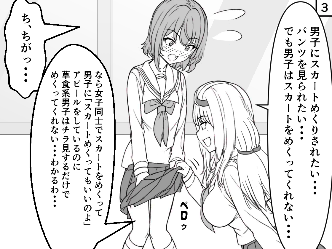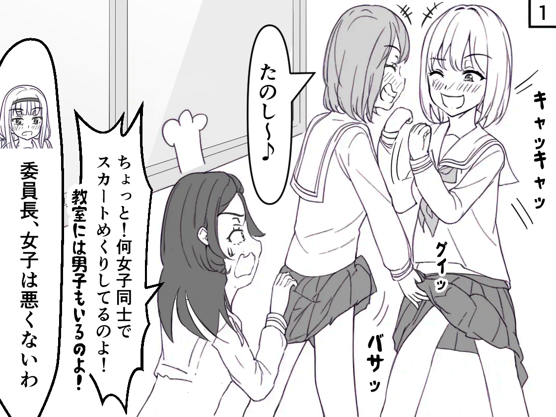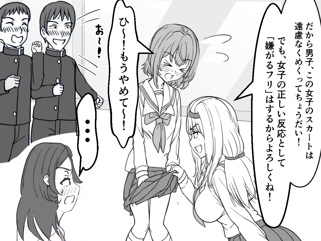 リアルでも稀に散見される、学校の休み時間に男子もいる教室で女の子同士でスカートめくりをしている女生徒たちの話です。